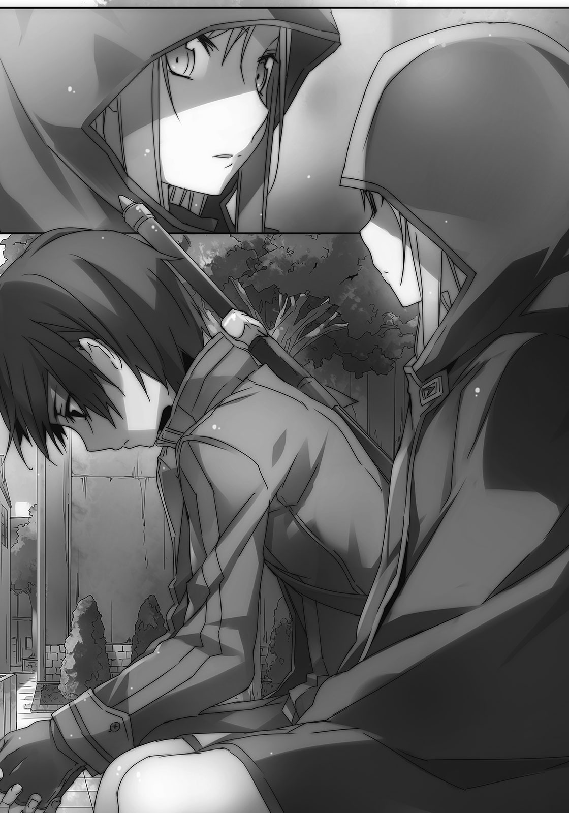 Ella lo conoció por primera vez hoy, así que no hay una razón para disculparse con ella. Ella miró desde debajo de su capilla al espadachín; el hombre con una chaqueta gris un poco descuidada, estaba sentado en el banco, inclinándose hacia adelante y apoyando ambos codos en sus rodillas. Sus labios se movieron y Asuna de nuevo escucho su voz.