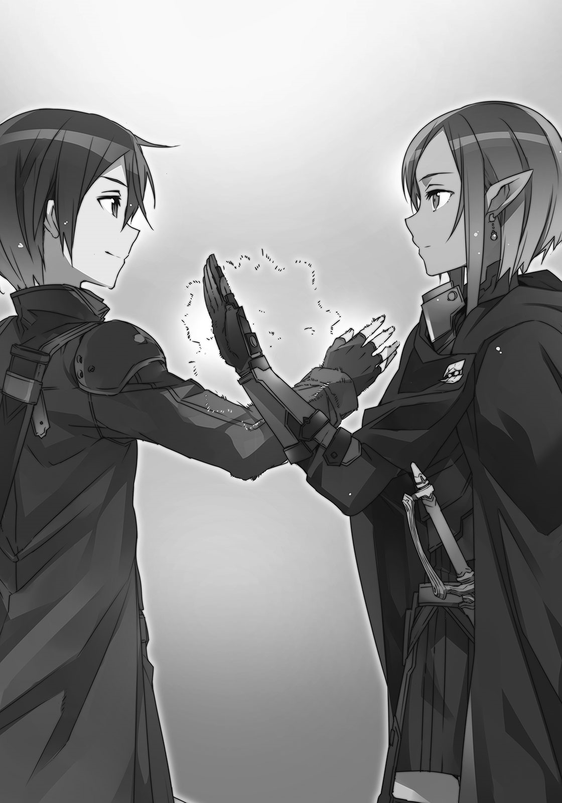 – pero eso no era así de simple. Como un miembro de la fuerza de la línea delantera de SAO, tenía una obligación de compartir la información que aprendía de otros de la delantera. Ellos necesitaban saber que el campamento elfo podía producir armas valiosas del sexto piso – así como también la posibilidad de que podías mantener vivos a los caballeros elfos en la misión «Llave Jade»...