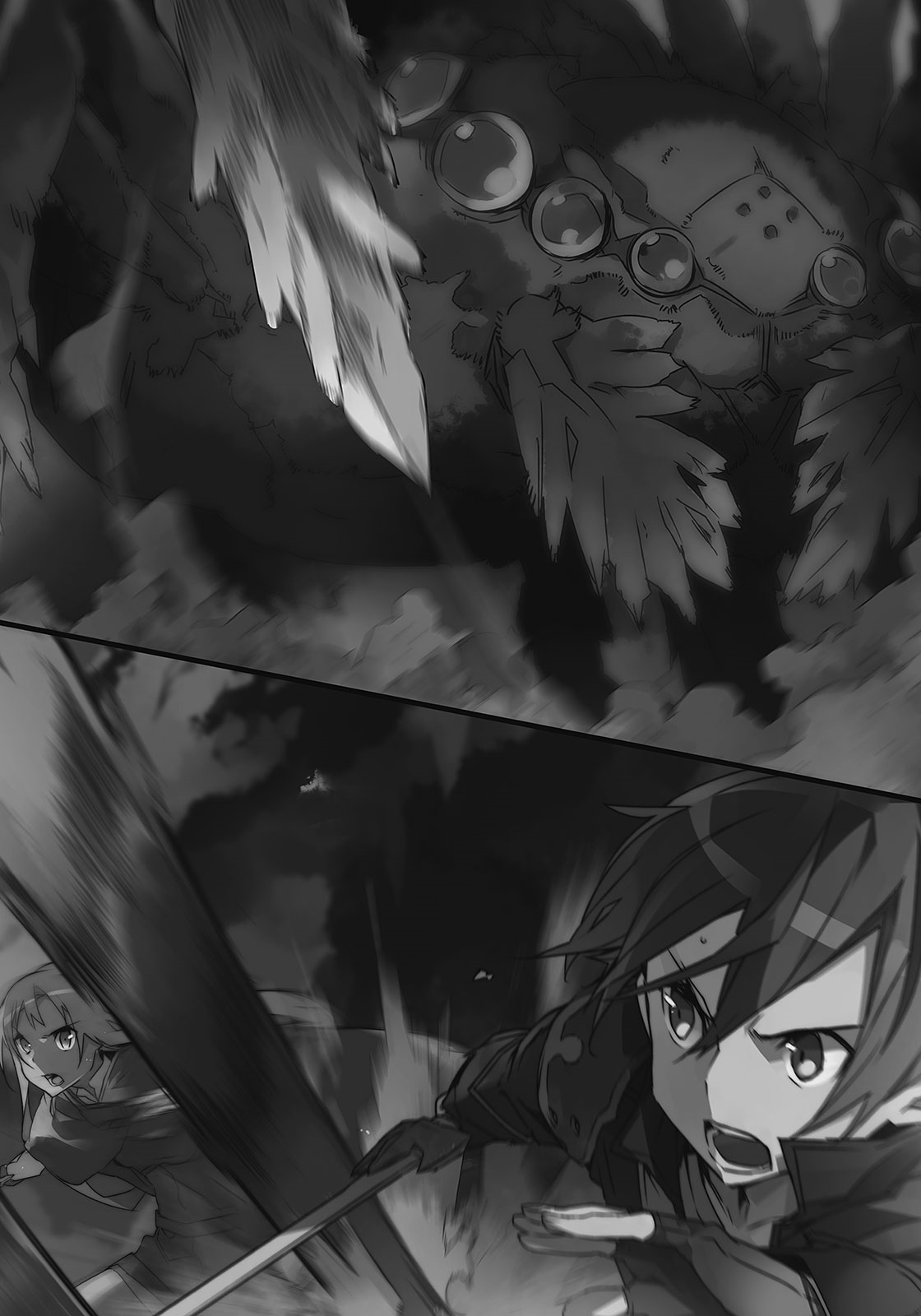 Asuna maravillosamente evitó los colmillos venenosos de la araña que venía a atacarnos, luego dirigió un furioso Linear en su ojo enorme. Los colmillos venenosos y el hilo pegajoso era algo con lo que no se debía jugar, pero la Thicket Spider era uno de los monstruos tipo insecto más fáciles hasta este punto. No volaría o escaparía, y su escondite no estaba protegido por un caparazón