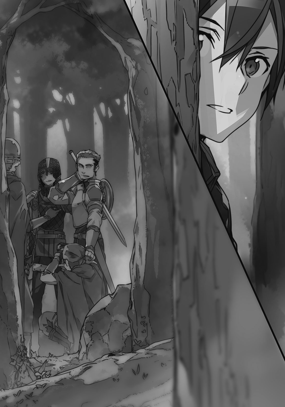 De repente sentí un sobresalto de Asuna que atravesó mi espalda. Ella debió haber llegado a mi conclusión. Al otro lado de los Dragon Knights y el elfo de bosque de elite debería haber otra piel oscura, cabello purpura Guarda Real Élfico Oscuro… en otras palabras, una segunda Kizmel.
