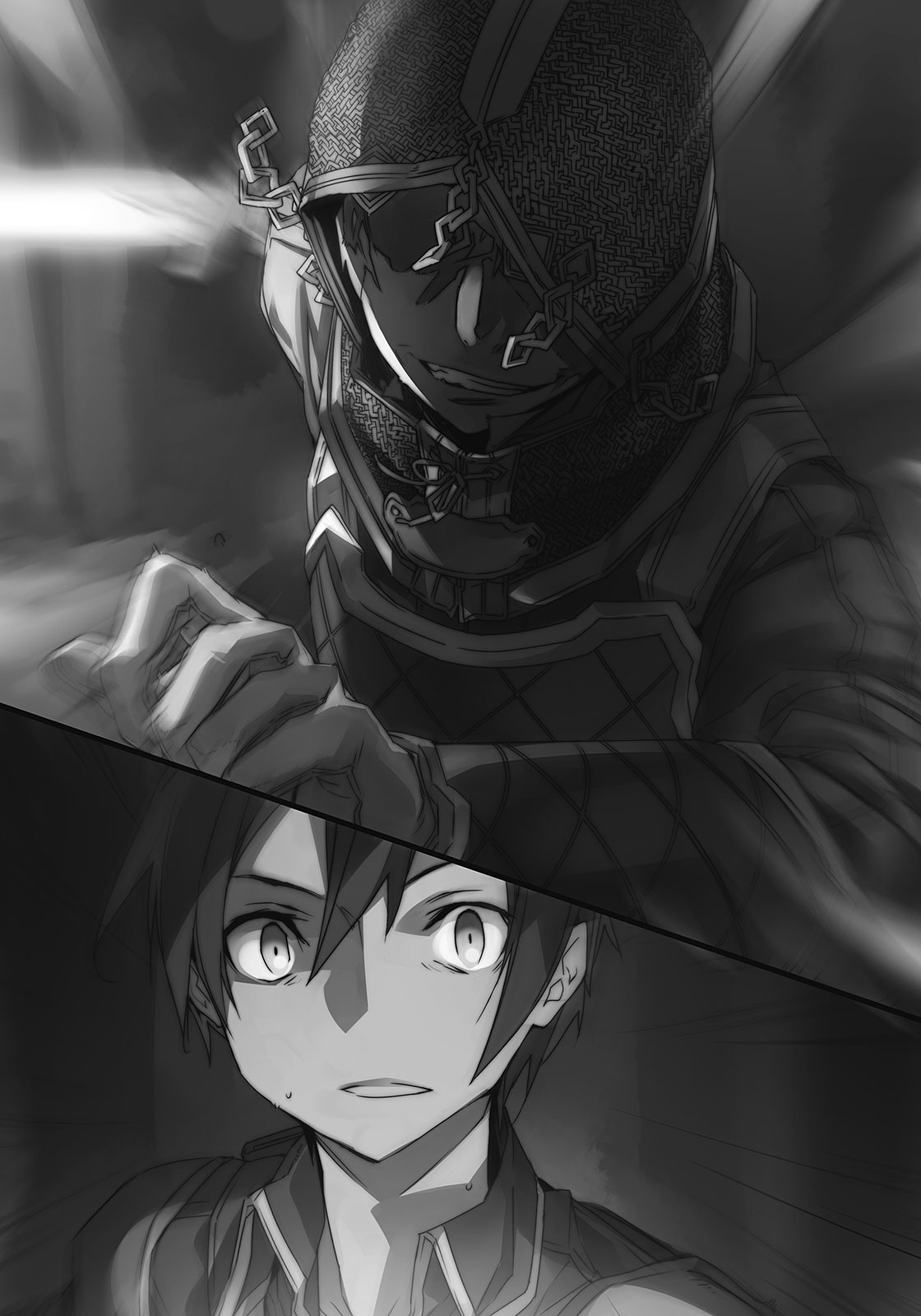 — Ja, ja, ¿por qué?, lo haces sonar como si yo estuviese esperando aquí para emboscarte, Kirito –dijo casualmente, indicando que conocía mi nombre. Hubo una amplia sonrisa en su rostro, pero como siempre, no podía verle los ojos–.