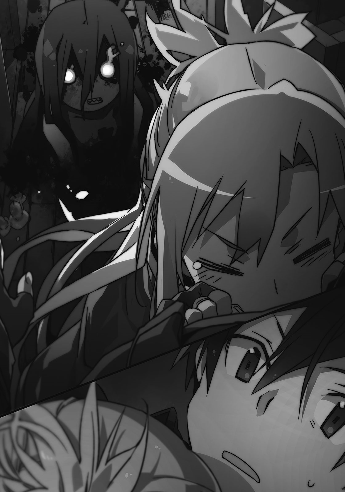 Pensó en ello pese haberse prometido no volver a lamentarse del pasado en el que ella salió de su habitación en el Pueblo de los Inicios. Ahora sólo debía fijar su vista hacia el lejano piso número 100 de Aincrad y continuar avanzando en su intento de superar el juego. Y si por desgracia se topaba con un monstruo de tipo astral, simplemente lo iba a evitar.