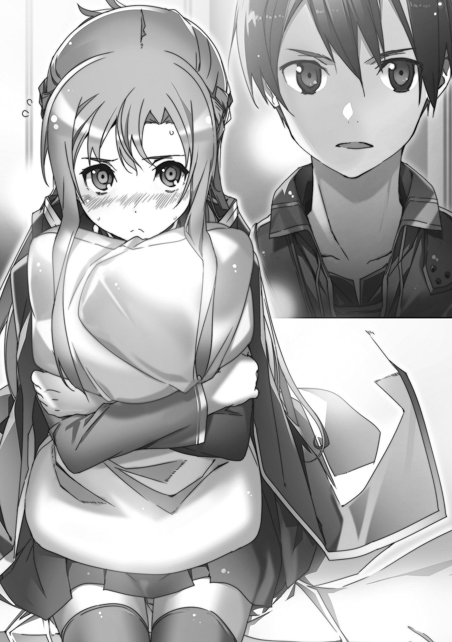 Afortunadamente, antes que pudiera decir o hacer algo vergonzoso, Asuna abrió su menú y manipuló su equipamiento. Una luz envolvió sus piernas por debajo de su falda de cuero, y se desvaneció dejando al descubierto un par de medias largas de color blanco.
