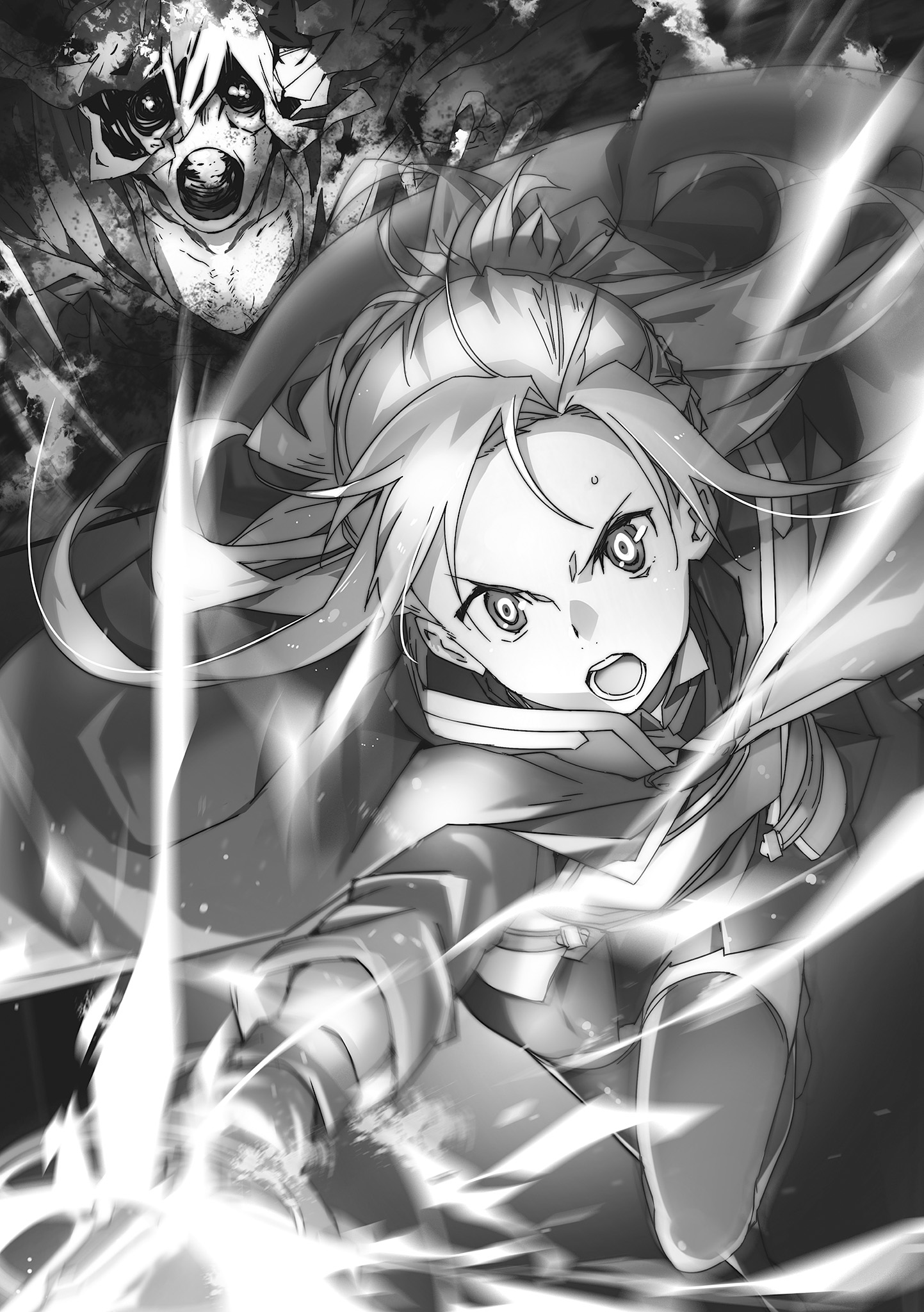 Asuna aspiró profundamente pero liberó suavemente el aire después de un momento. Luego se dio vuelta—sus dedos delineaban los bordes del estoque plateado que reposaba a la izquierda de su cintura.