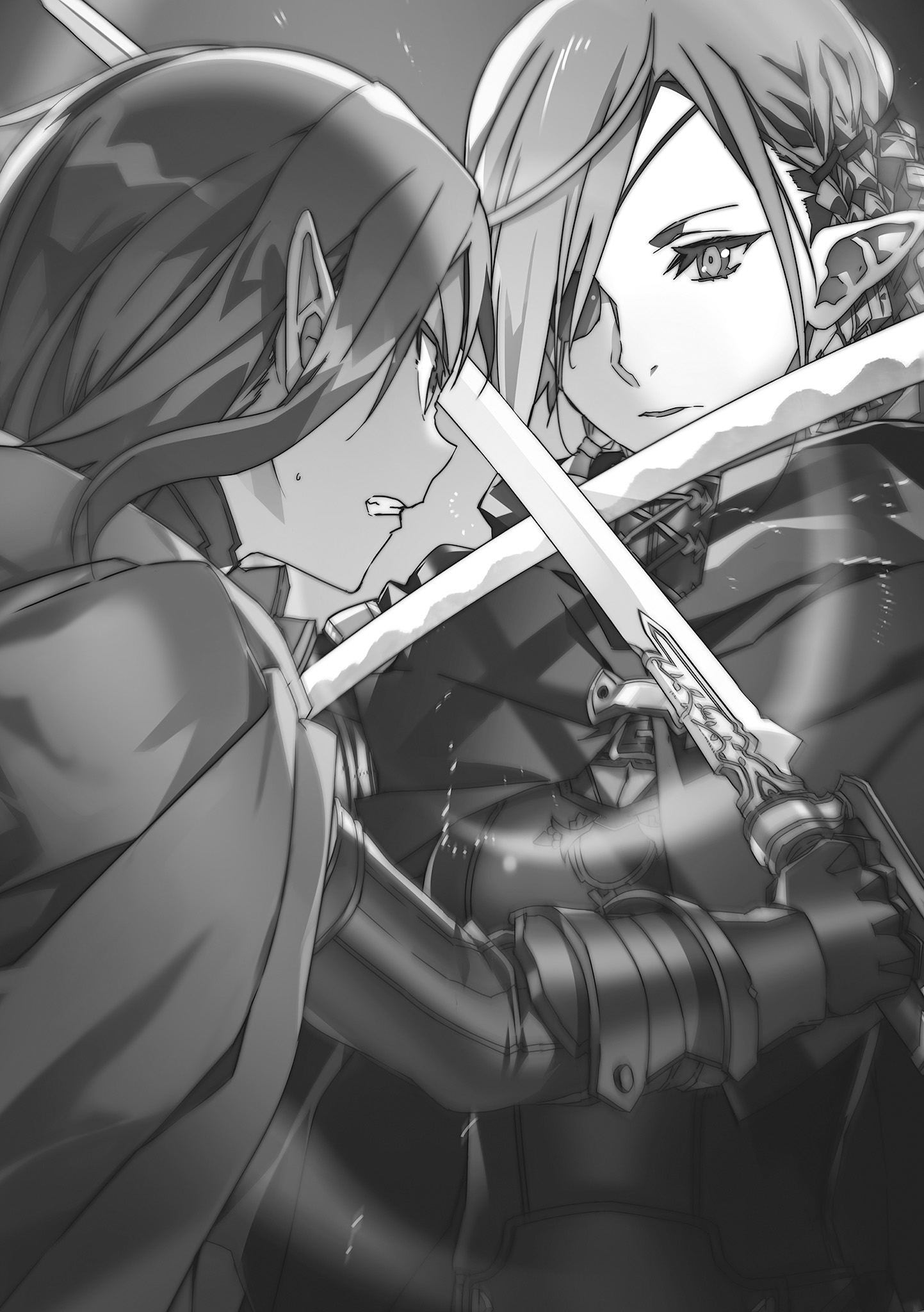 " ... Hey, Kirito," murmuró Asuna para calmar sus nervios mientras se agachaba detrás de mí, "Me he estado preguntando ... Son los elfos caídos los que quieren las llaves ocultas, y el hombre del poncho negro los está ayudando con eso, cierto?"